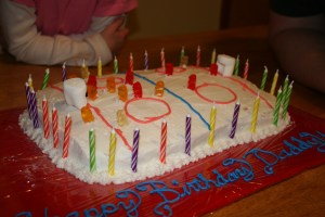 This year my children asked if they could plan their father’s birthday cake. I didn’t see any problem with this, although I did begin to wonder after they started throwing out possible ideas. They decided on a hockey rink theme. This went through many phases, but the end result turned out well, even with the insistence that we use 33 individual candles on the cake. The goals are made out of large marshmallows (not homemade this time – I wasn’t informed in enough time to make everything). The puck is a brown M&M, and the hockey players and refs are gummy bears. The kids didn’t seem to notice that there were no hockey sticks, which probably would have resulted in a second trip to the store for more supplies.