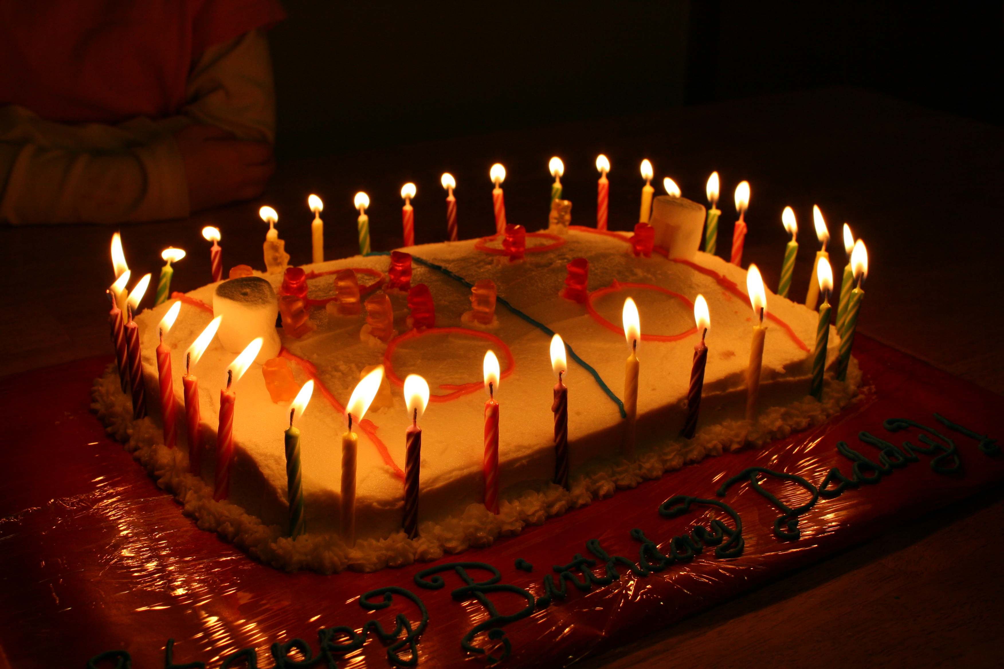 Candles can be a hazard when you get to this age. They are really bright and give off some nice heat. My husband joked that tiki torches might be a great way to light up a hockey rink. No gummy bears were harmed in the photographing of this cake, although there were many fatal casualties during the making and eating of it.