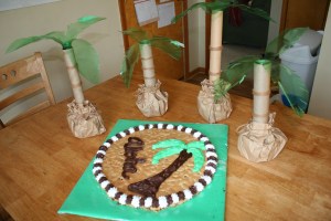 We made grass skirts for the food tables out of a large roll of donated green paper. Then we made repurposed palm tree table toppers for all of the tables where people would be eating. Oddly enough, these were widely popular and people were taking them home. My children had fun helping me make these. They were completely recycled, using empty paper towel rolls, empty green soda bottles, brown paper from packages (I now have the song from The Sound of Music going through my head), and beans that were used at a previous sensory class to weigh them down. I had forgotten how much fun sensory tubs are for my kids. We’ll be making a new table to hold a tub – to go out in the garage.
