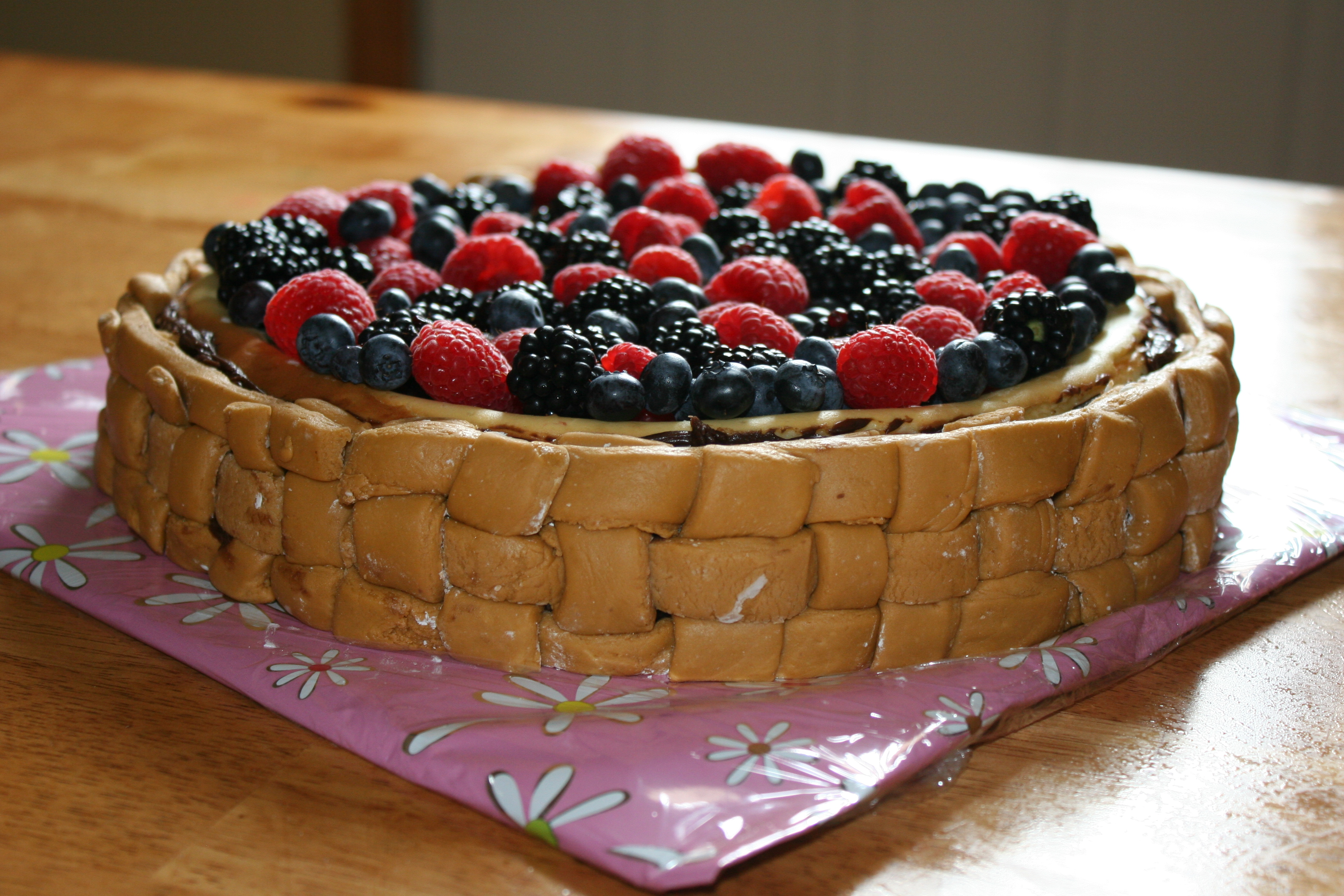 For my daughter’s birthday, she requested a lemon cheesecake that looked like it was a basket of berries that she had just picked. My husband is the cheesecake baker in the family, so I handed that portion off to him. I had never made fondant before, but it seemed like the most plausible way to form the basket portion. It turns out that marshmallow fondant is amazingly easy, and extremely sticky, to make. After rolling it out, I cut and weaved it into a basket design. Some chocolate frosting helped it adhere to the cheesecake. My daughter placed blackberries, raspberries, and blueberries over the top, declaring it the best birthday cake ever.