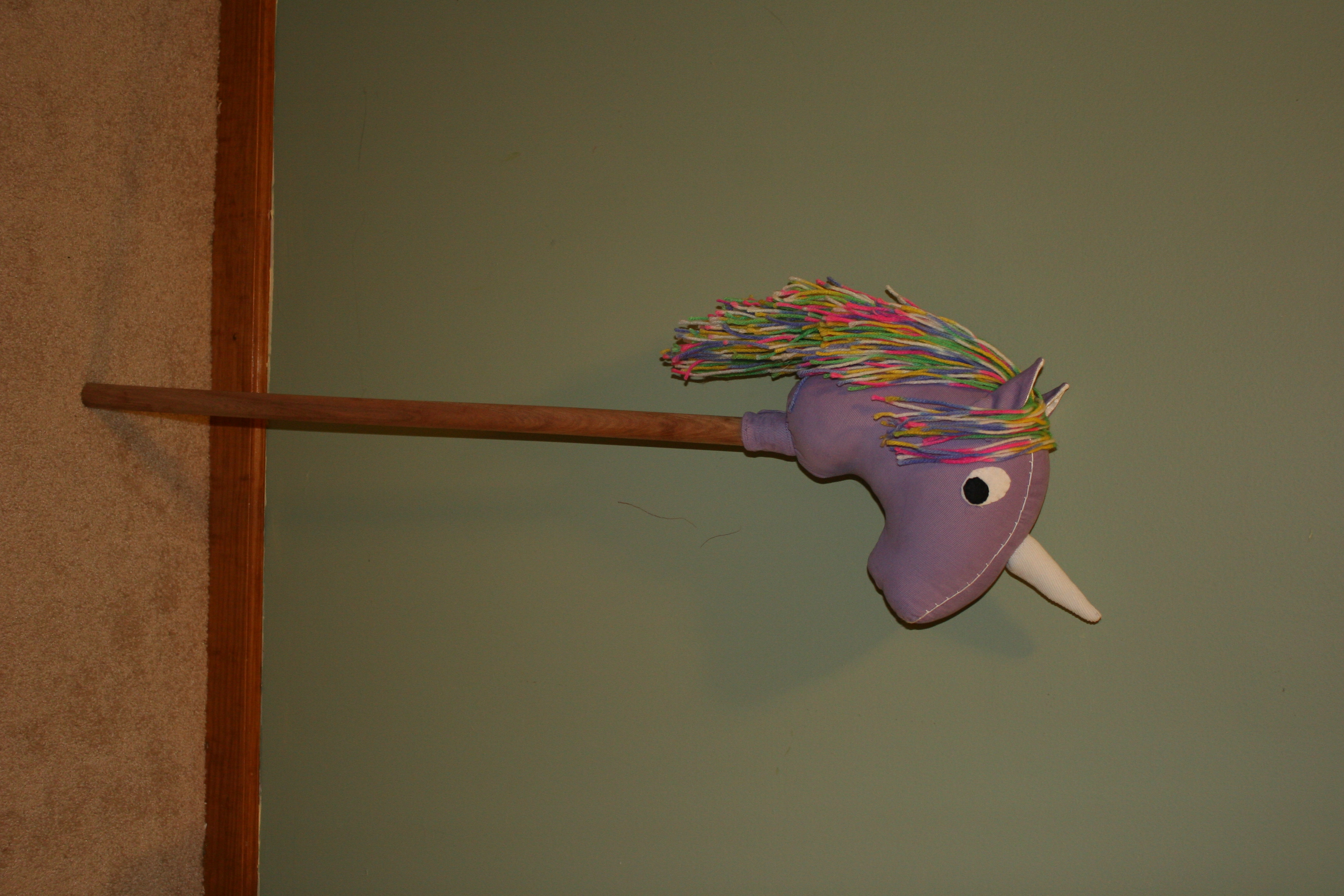 I thought my daughter might like a unicorn version of the stick horse I made earlier this year for her birthday, as she likes mythical creatures. I had a scrap of lavender corduroy that was just big enough to use, along with a scrap of white corduroy for the horn. She picked the rainbow yarn out of our stash.