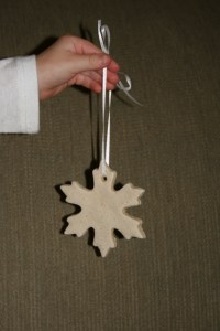I’ll be posting one ornament each Monday in October. This first ornament is simple and sweet – a salt dough snowflake tied with some white ribbon. Ingredients for salt dough can be found in most household pantries. The snowflake cookie cutter I used is one of those nice chunky Wilton cookie cutters. They are a great size for salt dough ornaments. A straw made making holes in the unbaked ornaments fast and easy. The ribbon is actually left over from my wedding – twelve years ago. Apparently, I don’t declutter everything.