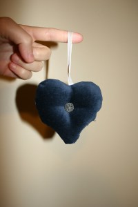 I was feeling rather unspired for my fourth set of ornaments for the ornament exchange. My commitment to only using items I already had on hand was contemplating things. Finally, after sewing some dresses for my daughters, my eyes fell upon some navy velvet scraps, and I came up with the idea for my last set of ornaments. The velvet was given to me by another member of our attachment parenting group. Her mother no longer wanted the fabric and I knew some day it would make lovely dresses. I used antique buttons, given to me by another member, who was parting with her grandmother’s button stash. Most of the buttons I used are white or silver, but this heart has an antique star on it. I’ll be keeping this one for our family.