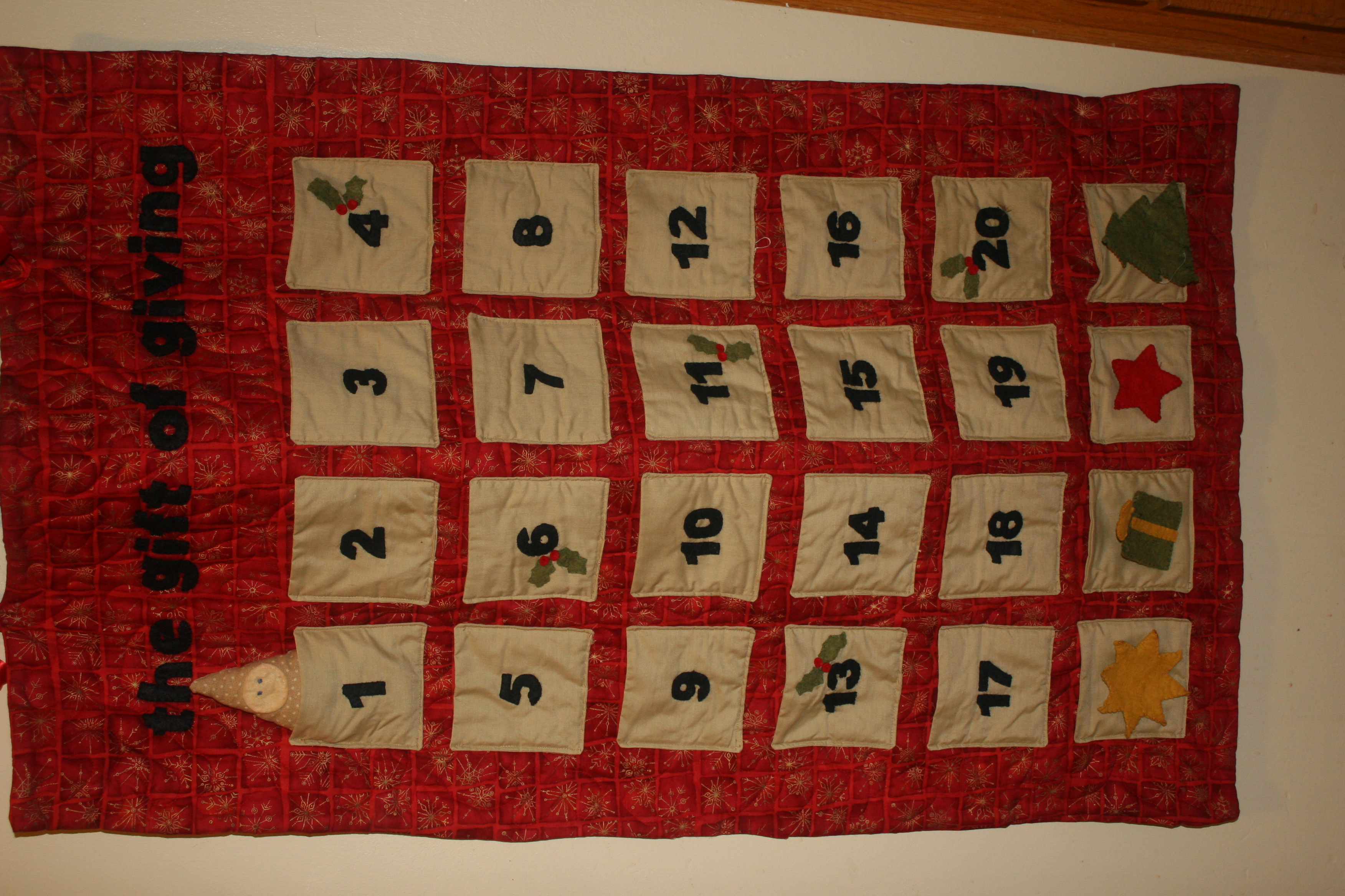We ended up with a Solstice calendar. I’m not certain why I felt it necessary to hand stitch all of the tiny pieces of felt on, but it does look nice. The same ribbons that we use to hang it tie the calendar when it is rolled up. It’s also quilted, so it’s rather sturdy.