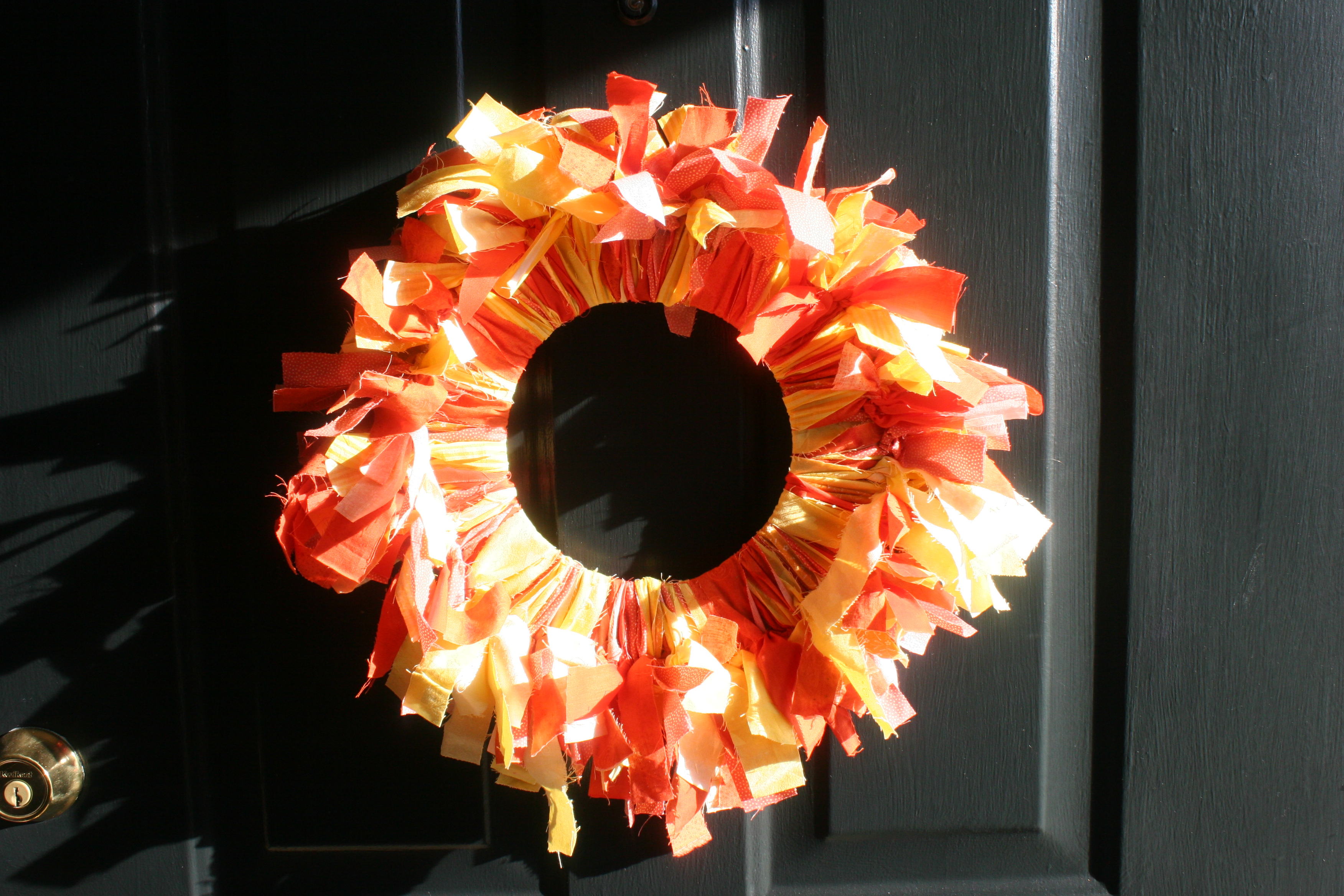 Strips of roughly cut fabric are tied onto the form. The only caveat with this wreath is that you probably don’t want any cardboard showing. We opted to just tie on a lot of fabric. However, if I hadn’t had any children older than preschool age, I think I may have first wrapped the cardboard in fabric and then had them tie their pieces on. Scrunching the fabric together to hide the cardboard meant a lot more time spent on the wreath.