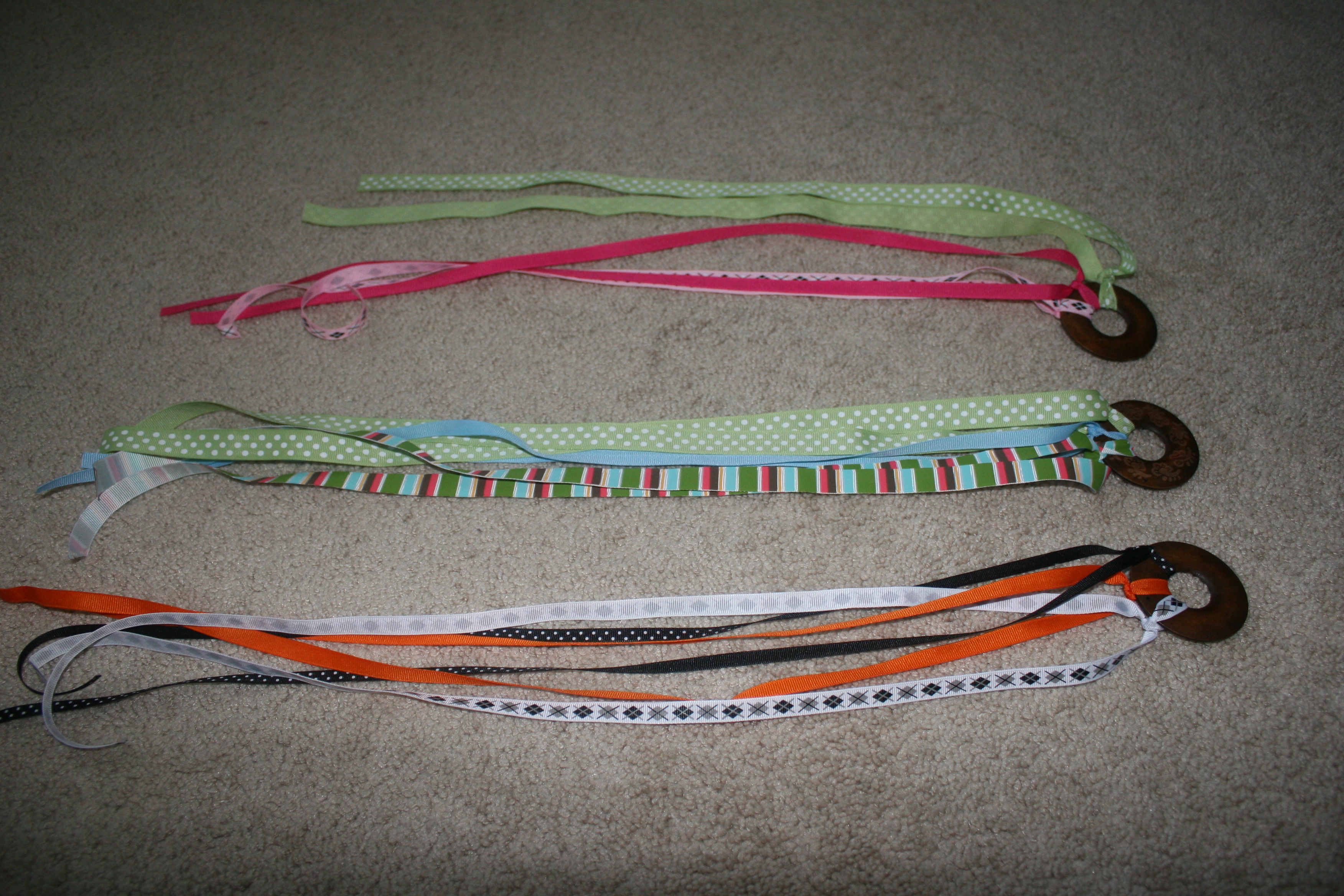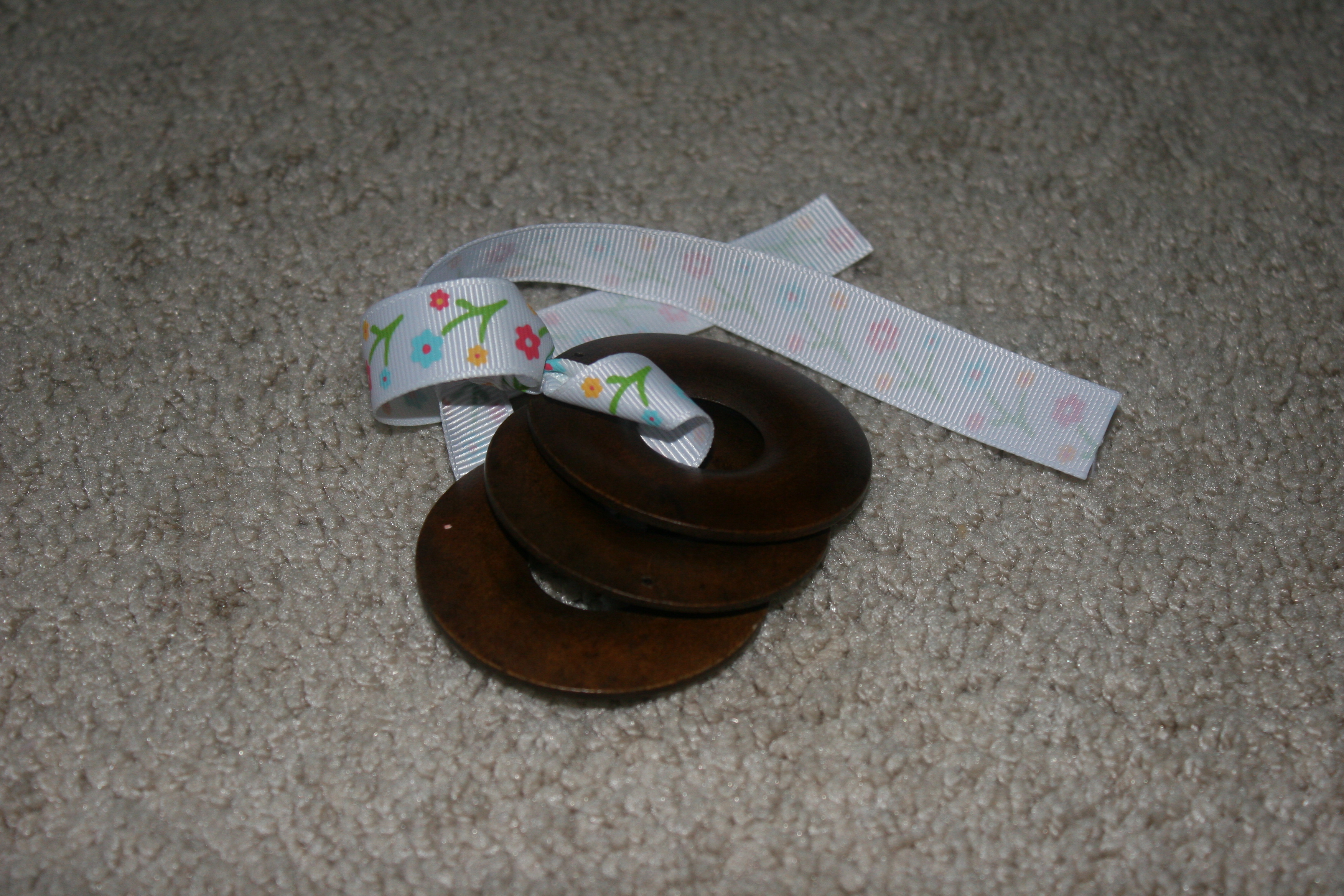 We ended up making some keys for his baby sister to play with. The ribbon is much shorter and we used three of the wooden medallions which can move freely on the ribbon.
