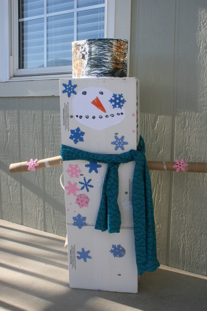 They didn’t let this get them down, though. Instead, they were inspired by a picture of a snowman someone had made from boxes and decided to make their own version. According to my three year old, the pink snowflakes are snowflakes of love.