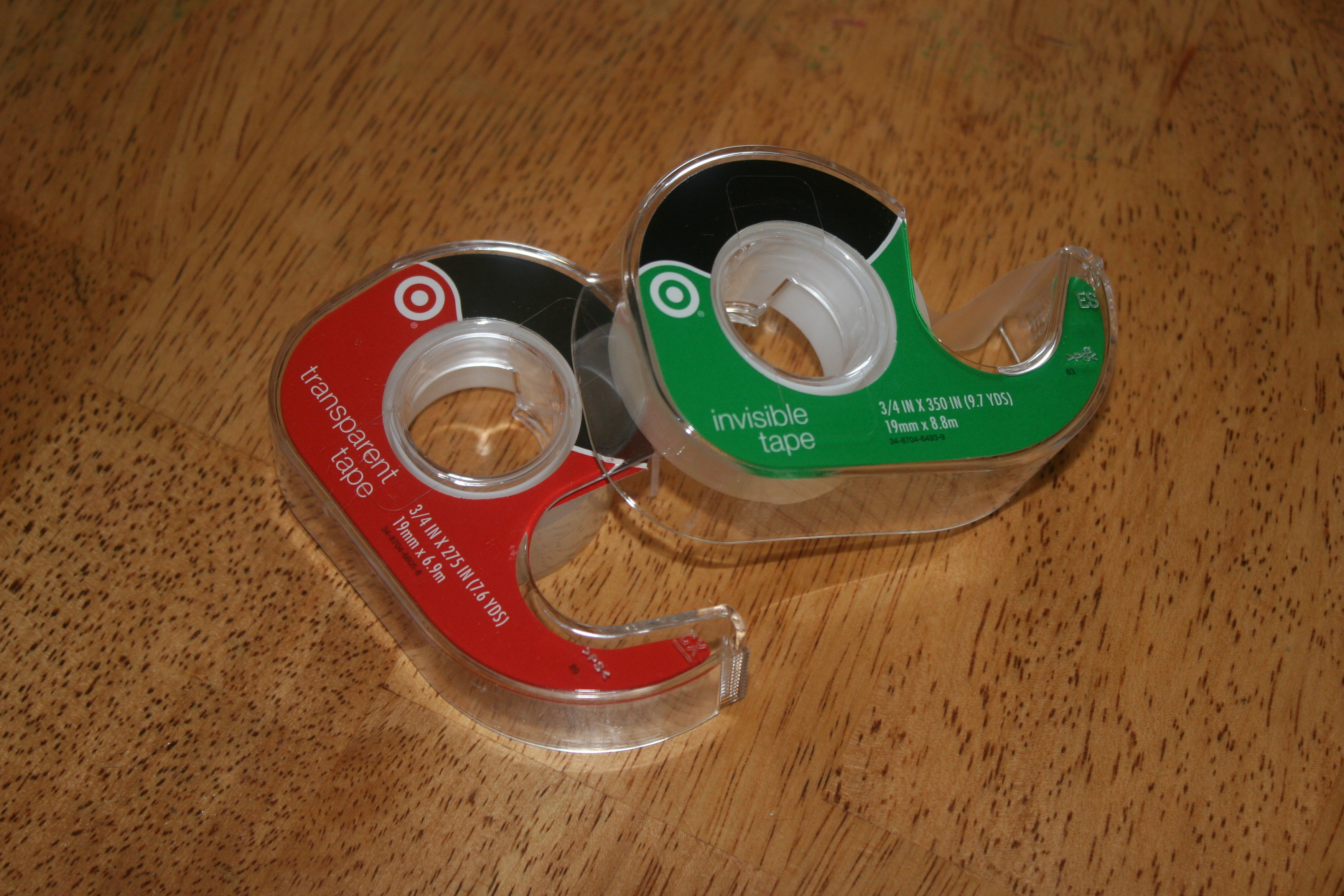 The next time we went to the store, list in hand, I reached for replacement tape. Inspiration struck as I saw the tape with different colored cardstock in it. Aha! Color coded tape! I picked up a 4 pack of transparent tape in red for my children and a 3 pack of invisible tape in green for my own use. Never again would I have to search for tape to wrap a package or repair a torn piece of paper.