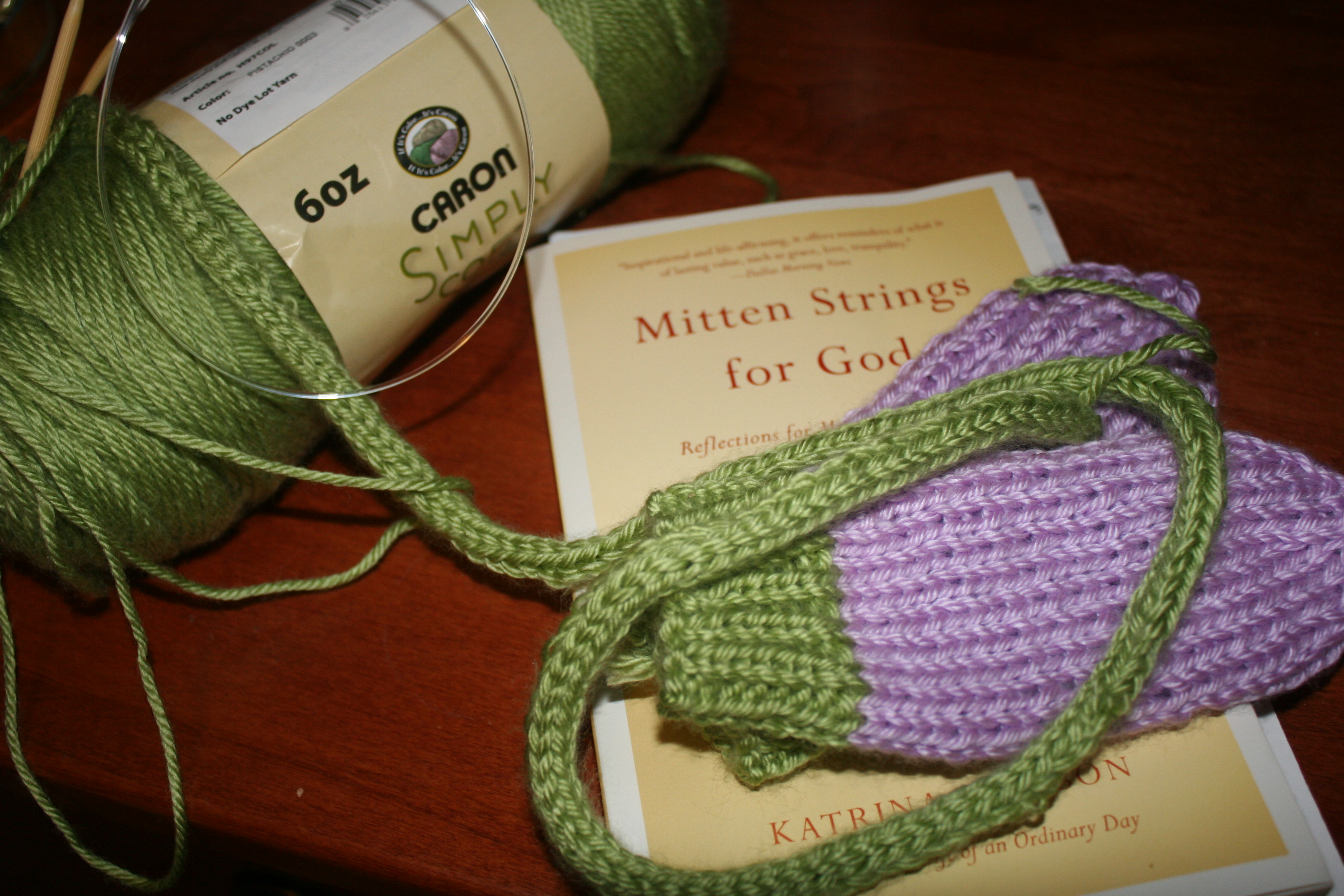 I have been knitting hats for my family and wanted to add mittens to go with them. For my first attempt, I decided to make some thumbless mittens for my one year old. The mitten string was becoming a bit monotonous.