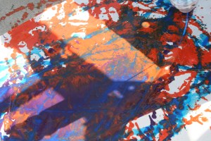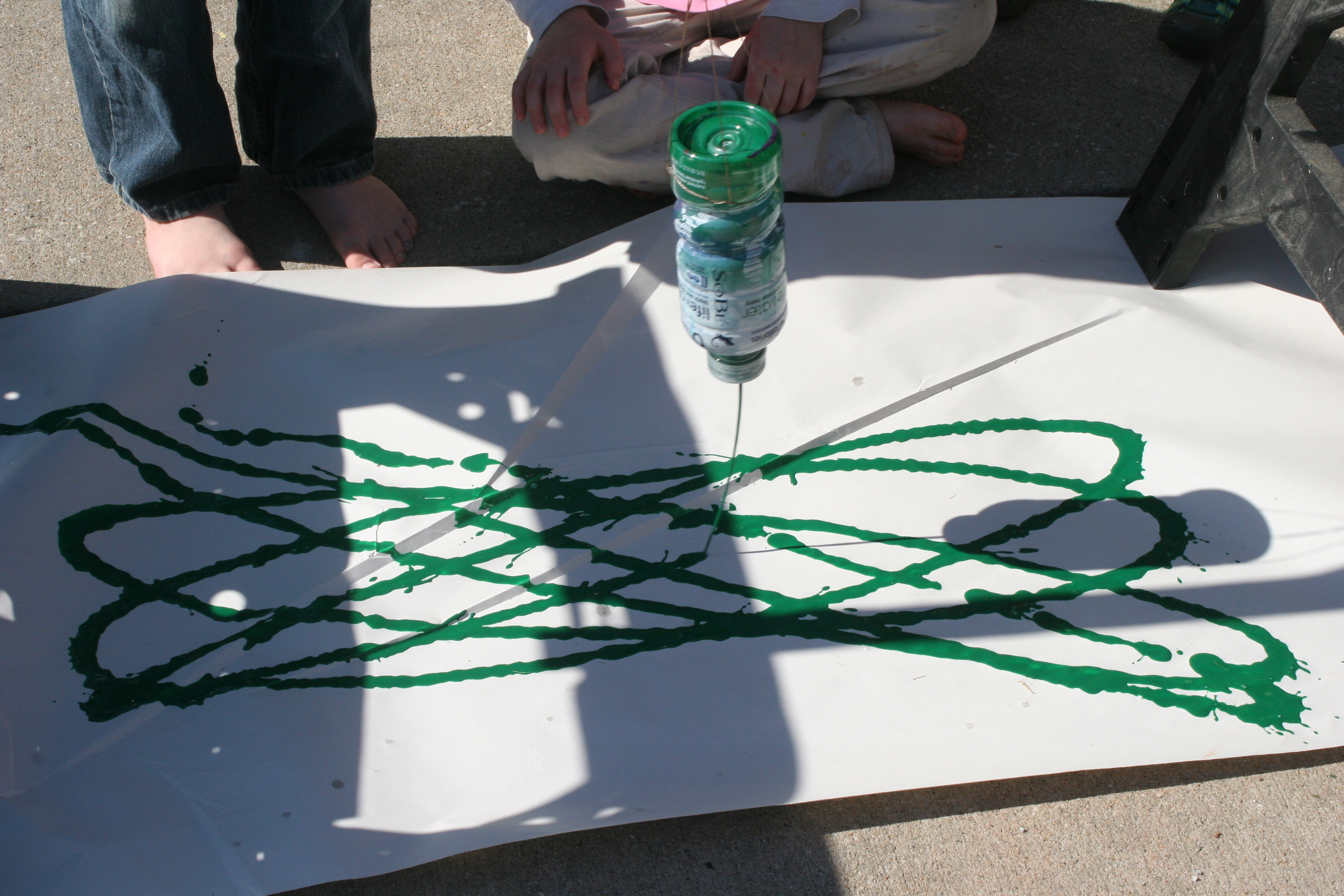 Lovely weather at the end of Septmeber had us spending a lot of time outside. We decided to improvise with a couple of saw horses, an extra board, some string, a water bottle out of the recycling bin, and watered down tempera paint. Walla! Pendulum painting!
