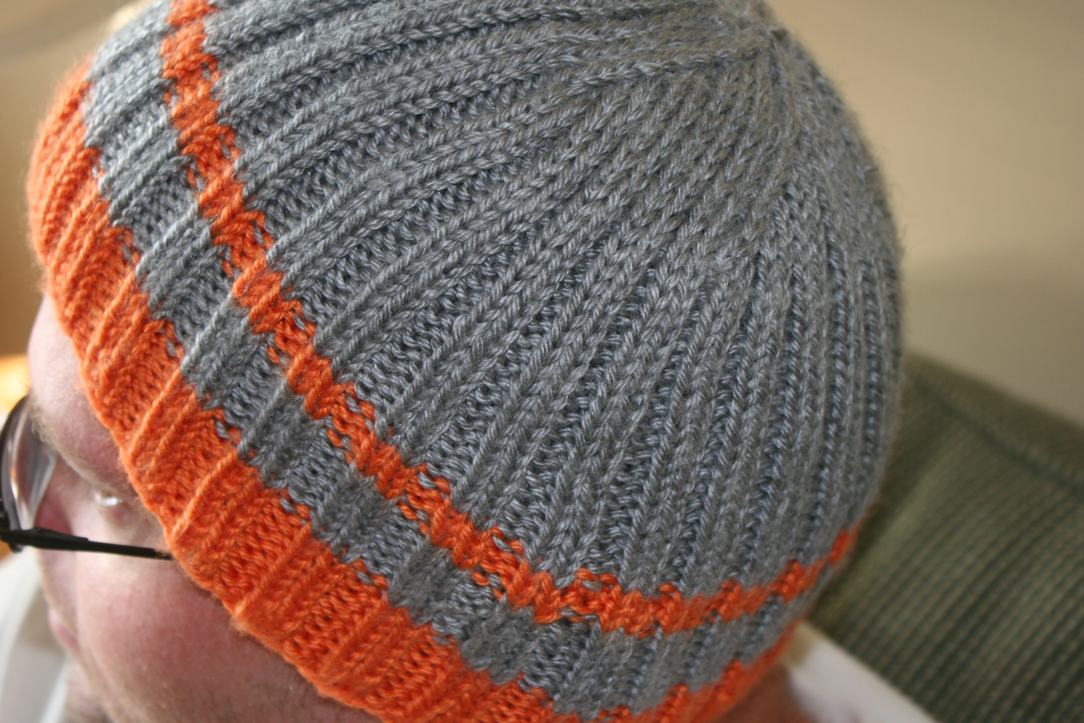 y hat. His coat is grey and orange, and I happened to have both colors left in my yarn stash. I don’t like knitting two of the same item. It becomes monotonous for me. I wanted something a little different, so I modified the pattern I had previously used to make this that. I’m happy to say it fits him much better.
