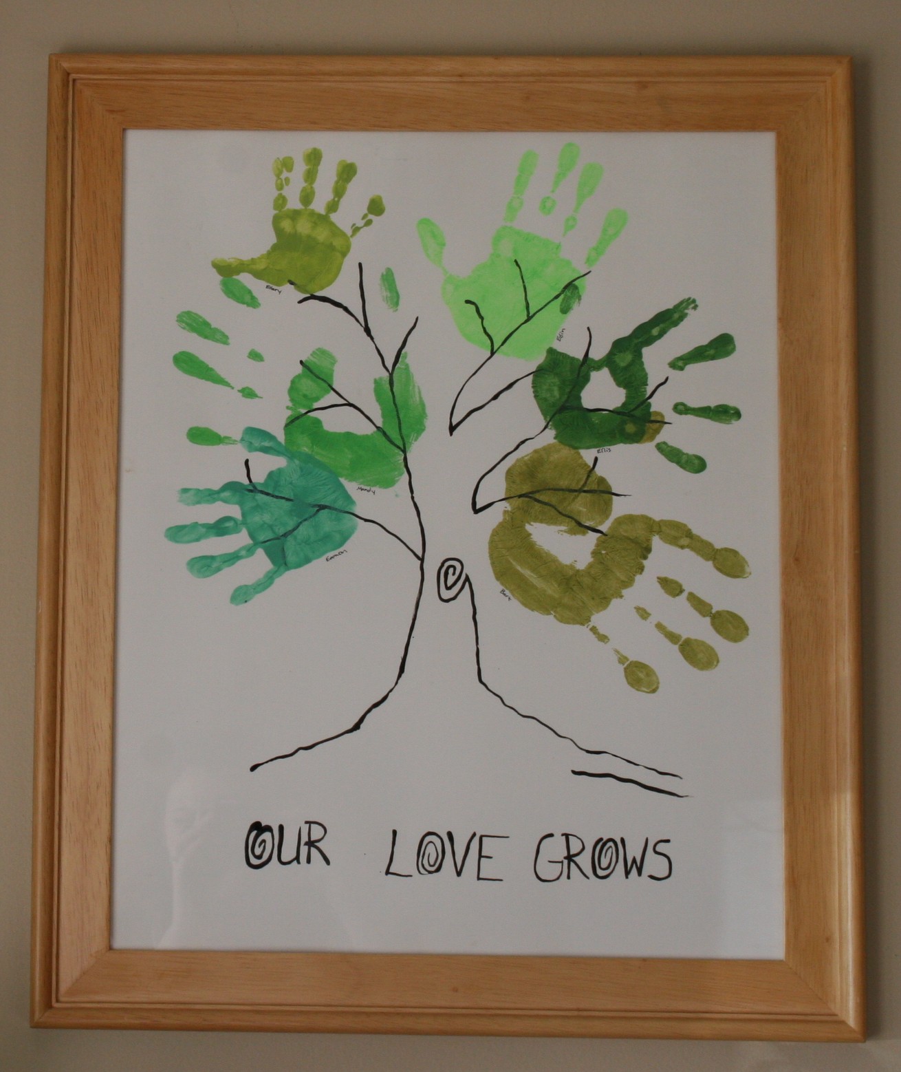 A repurposed frame was perfect for some family art. A free form tree outline provided the backdrop for handprints of our family in different colours. Below each handprint is the person’s name, so that we can look back and remember. It needed a finishing touch, so I added Our Love Grows.