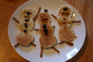 My children have been patiently waiting for snow in order to make a snowman, sled, build an igloo, and build an arsenal of snowballs with which to surprise their father. It hasn’t been forthcoming. So, one weekend as I set about making pancakes for everyone, I decided to surprise them with snowman pancakes. My husband set about scrounging for items to decorate the snowmen, and the kids were able to sit down for a wonder-filled breakfast. They still have to wait on their snow.