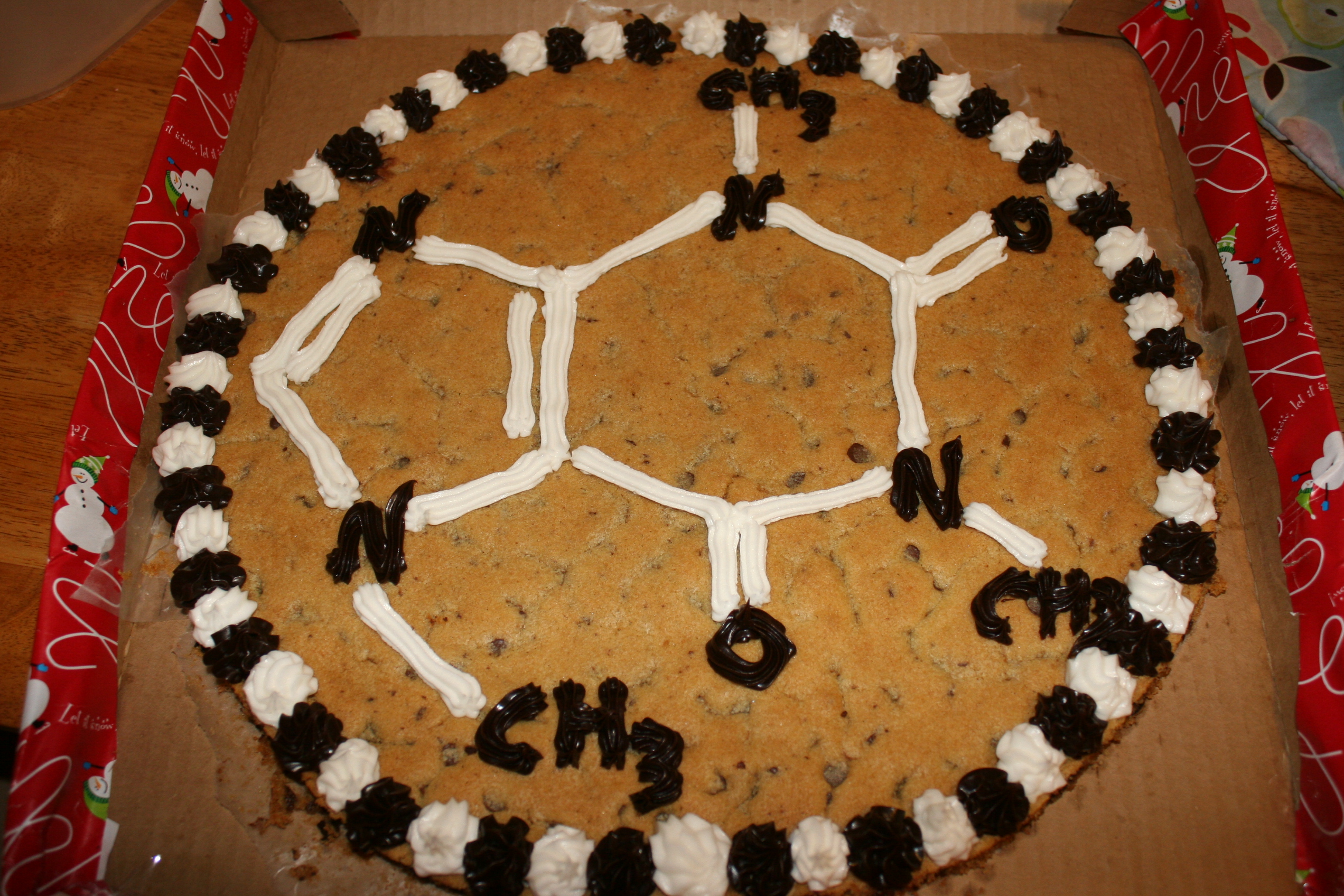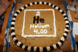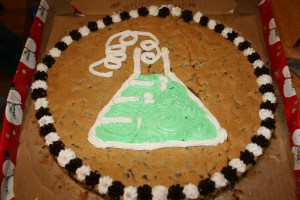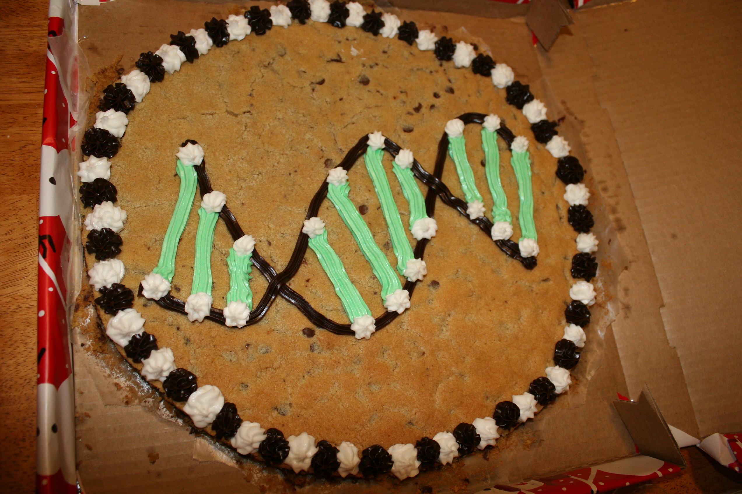 I post these at the risk of having these pictures end up on some blog such as Cake Wrecks. I needed to come up with some gifts for my husband’s group members last December. Gift certificates weren’t fitting in the budget but I needed something substantial. I ended up doing science themed cookie cakes for everyone, personalized based on what each member works with: an atom, a double helix (DNA), a flask for prep work, helium, and a caffeine molecule.