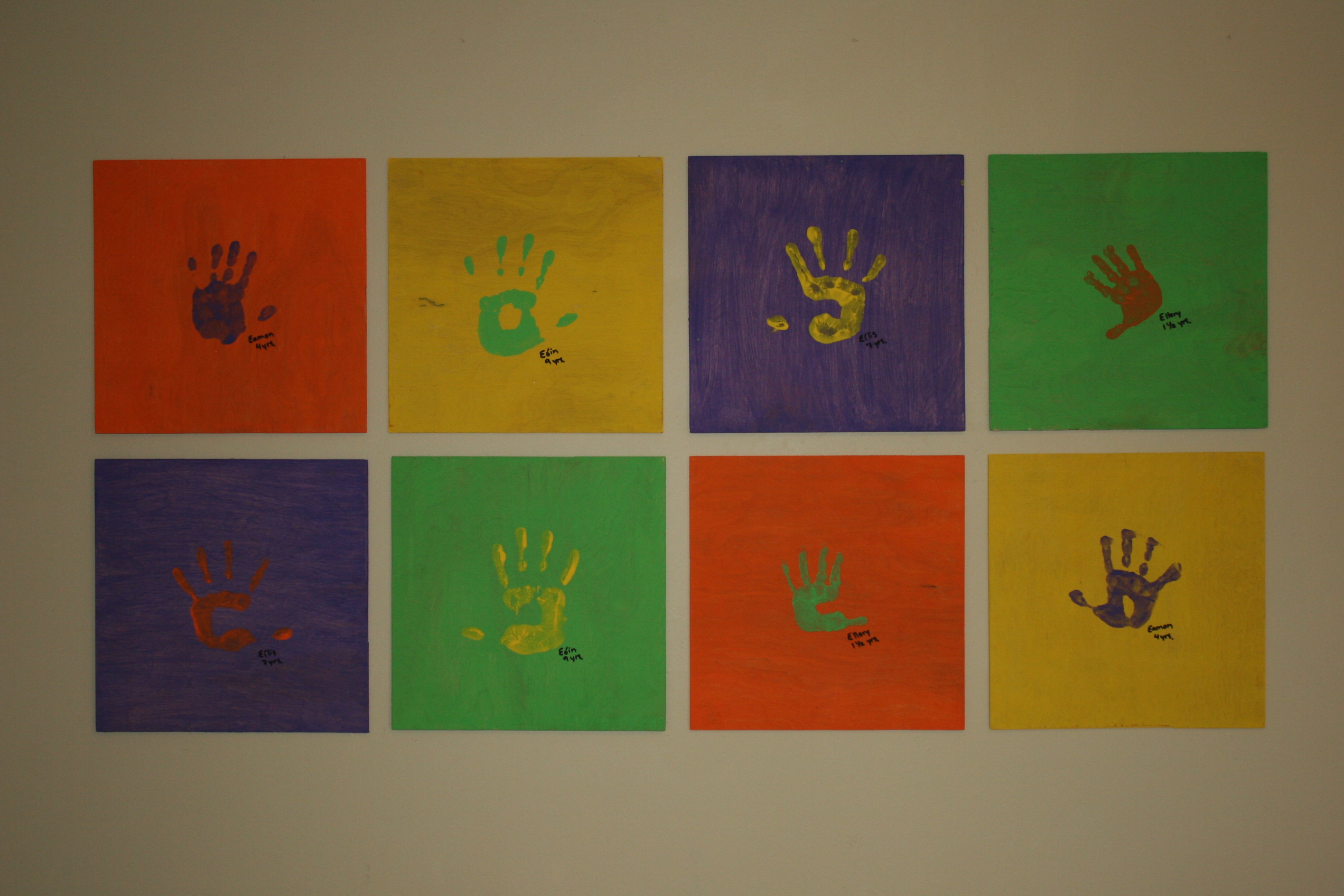 If you are looking for a fun and easy way to decorate a play area or other area in your home, try these easy Any Warhol style hand prints. I had originally planned to use canvas, but canvases cost more than I wanted to spend. Instead, I used approximately one foot square pieces of leftover quarter inch plywood. A thin layer of acrylic paint allowed the wood grain to show through. Painting hands is always a giggly affair at my house, and this project was no exception.