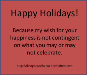 Back to the phrase “Merry Christmas,” though. I didn’t stop saying it because I am no longer a Christian. (Please don’t try to convert me. I have studied religion in depth. I am confident with where I am in my journey.) I stopped saying “Merry Christmas” back when I was still a Christian. Why? you ask. The reason is simple. I realized that when I said those two simple words, no matter how well-meaning, the supposed happiness that I was wishing the person was contingent. It was contingent on their celebration of the holiday I was specifying. It was about my holiday and therefore about me. If you know the other person and what they believe and celebrate, that can be fine. They share the same holiday with you, and therefore it is also about them. However, said to someone whose beliefs you are unsure of or whom you know celebrates something different, that contingency makes a big difference.